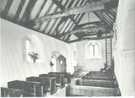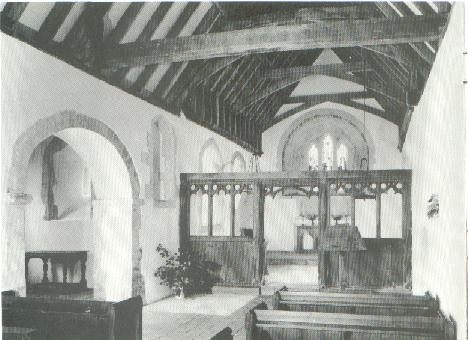 The diagram below shows the layout of the existing building, which consists of a nave and chancel (some 60 feet by 15 feet), with a north transept, south porch and west bell turret. The Norman building was cruciform and in the late 14th century the arches of the central crossing, with the exception of the arch to the north transept, were removed. This opened up the nave to the chancel, which was partitioned off by an oak screen, of which only the original main uprights still survive. In 1874 new tracery was provided at the sides to match a fragment of the original which had remained.