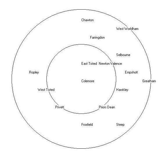 Chawton Colemore East Tisted Empshott Farringdon Froxfield Greatham Hartley Maud-Uitt Hawkley Newton Valence Priors Dean Privett Ropley Selbourne Steep West Tisted West Worldham |